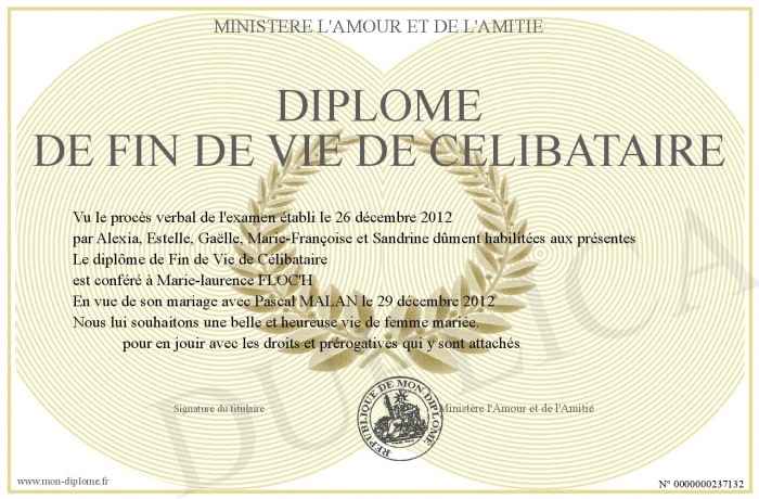Envoyez par email votre Diplôme de fin de Vie de Célibataire personalisé