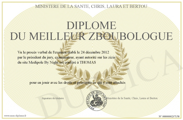 Envoyez par email votre Diplôme du meilleur ZBOUBOLOGUE personalisé