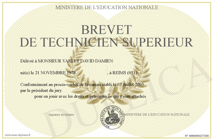Envoyez par email votre BREVET DE TECHNICIEN SUPERIEUR personalisé