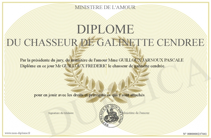 Envoyez par email votre Diplôme du chasseur de galinette cendrée personalisé