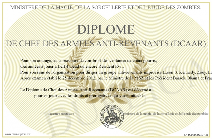 Envoyez par email votre Diplome de Chef des Armées Anti-Revenants (DCAAR) personalisé