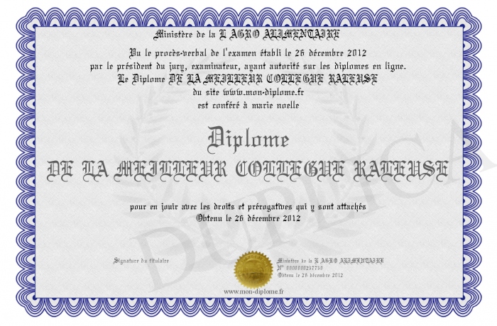 Envoyez par email votre Diplôme DE LA MEILLEUR COLLEGUE RALEUSE personalisé