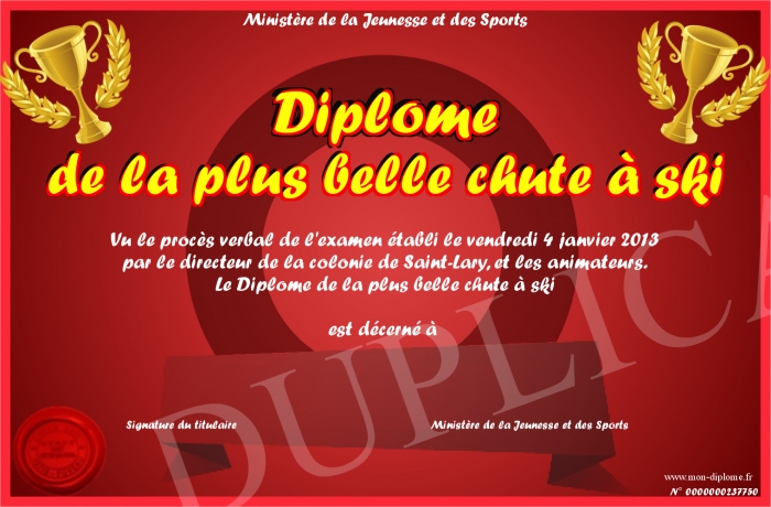 Envoyez par email votre Diplôme de la plus belle chute à ski personalisé