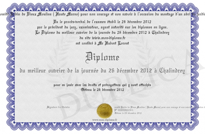 Envoyez par email votre Diplôme du meilleur ouvrier de la journée du 26 décembre 2012 à Chalindrey personalisé