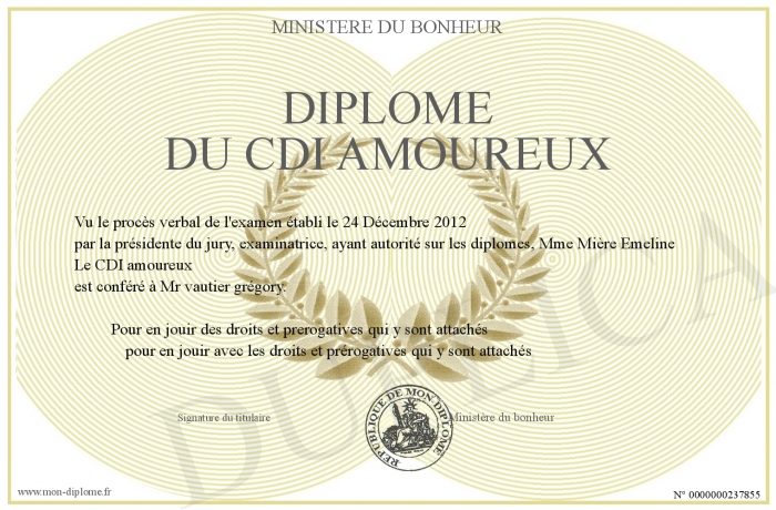Envoyez par email votre Diplôme du CDI amoureux personalisé