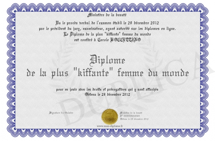 Envoyez par email votre Diplôme de la plus -kiffante- femme du monde personalisé