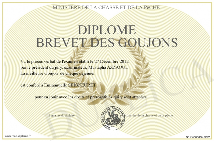 Envoyez par email votre Diplome Brevet des Goujons personalisé