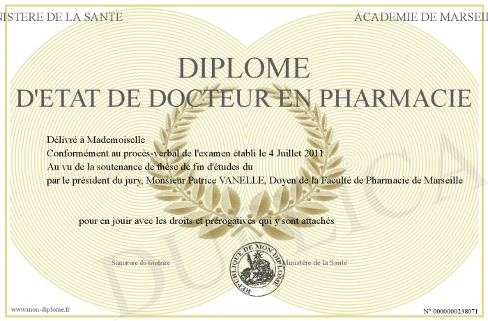 Envoyez par email votre Diplôme d'Etat de Docteur en pharmacie personalisé
