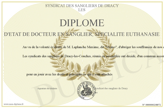 Envoyez par email votre Diplôme d'état de Docteur en sanglier, Spécialité Euthanasie personalisé