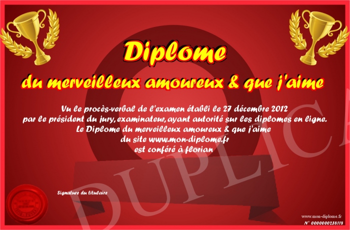 Envoyez par email votre Diplôme du merveilleux amoureux & que j'aime personalisé