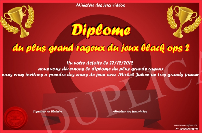 Envoyez par email votre Diplôme du plus grand rageux du jeux black ops 2 personalisé