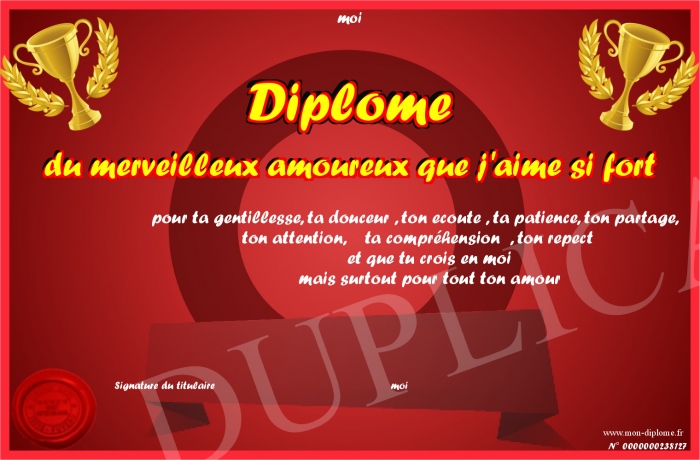 Envoyez par email votre Diplôme du merveilleux amoureux que j'aime si fort personalisé
