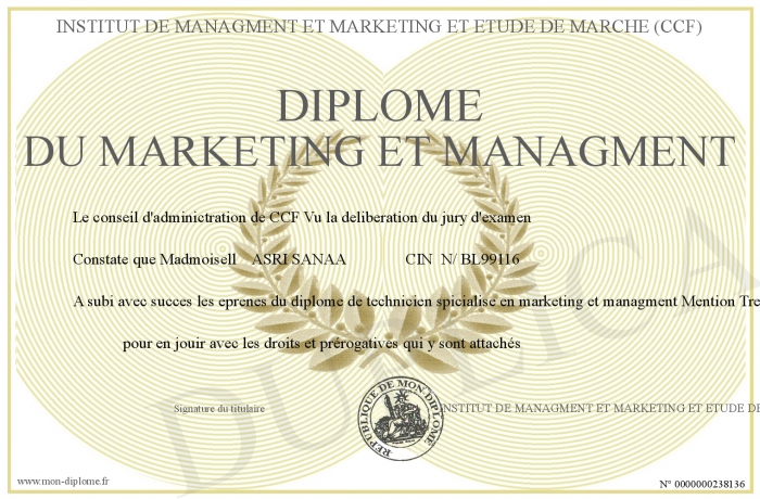Envoyez par email votre Diplôme du marketing et managment personalisé