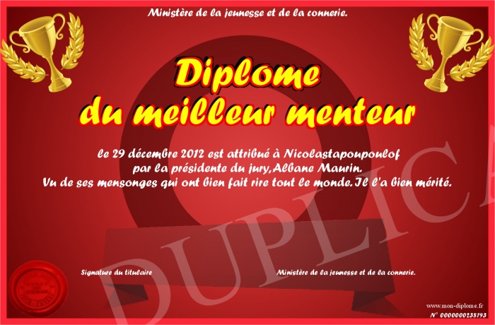 Envoyez par email votre Diplôme du meilleur menteur personalisé