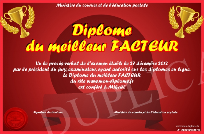 Envoyez par email votre Diplôme du meilleur FACTEUR personalisé