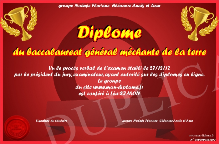Envoyez par email votre Diplôme du baccalaureat général méchante de la terre personalisé