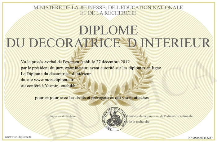 Envoyez par email votre Diplôme du décoratrice d intérieur personalisé