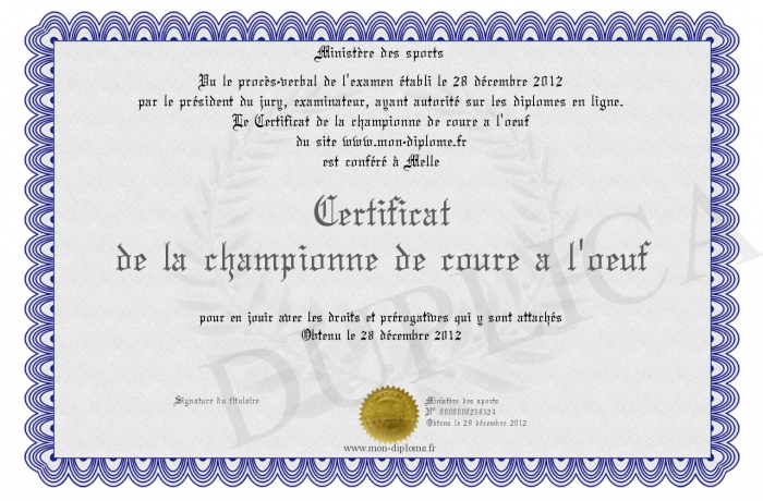Envoyez par email votre Certificat de la championne de coure a l'oeuf personalisé
