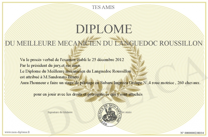 Envoyez par email votre Diplôme du Meilleure mécanicien du Languedoc Roussillon personalisé