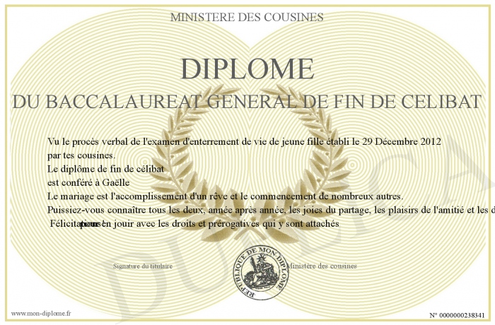 Envoyez par email votre Diplôme du baccalaureat général de fin de celibat personalisé