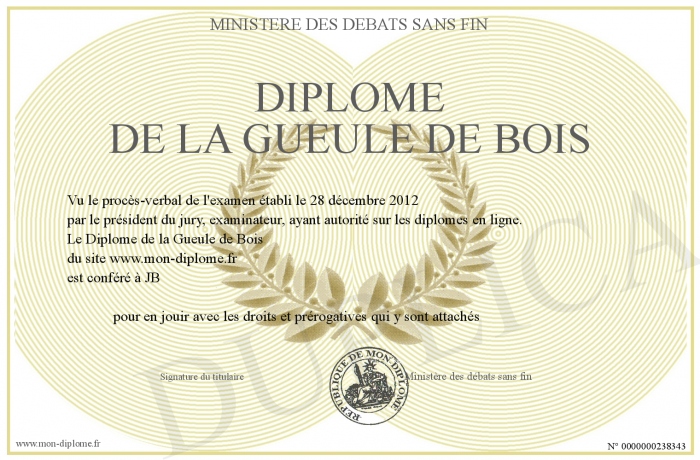 Envoyez par email votre Diplôme de la Gueule de Bois personalisé