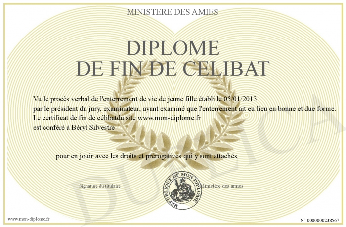 Envoyez par email votre Diplôme de fin de célibat personalisé