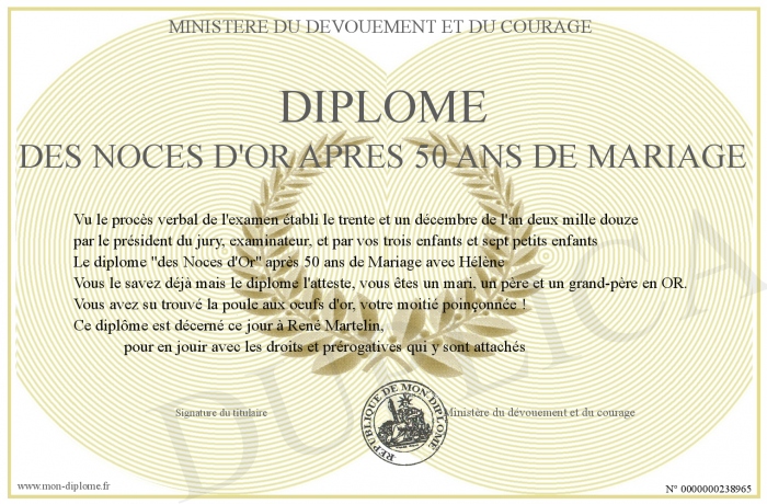 Envoyez par email votre Diplôme des Noces D'or après 50 ans de mariage personalisé