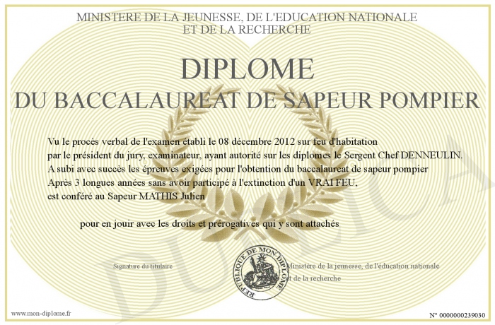 Envoyez par email votre Diplôme du baccalaureat de sapeur pompier personalisé