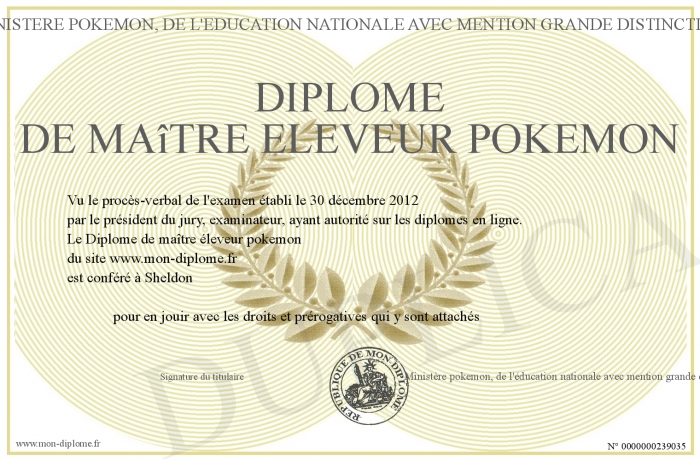 Envoyez par email votre Diplôme de maître éleveur pokemon personalisé