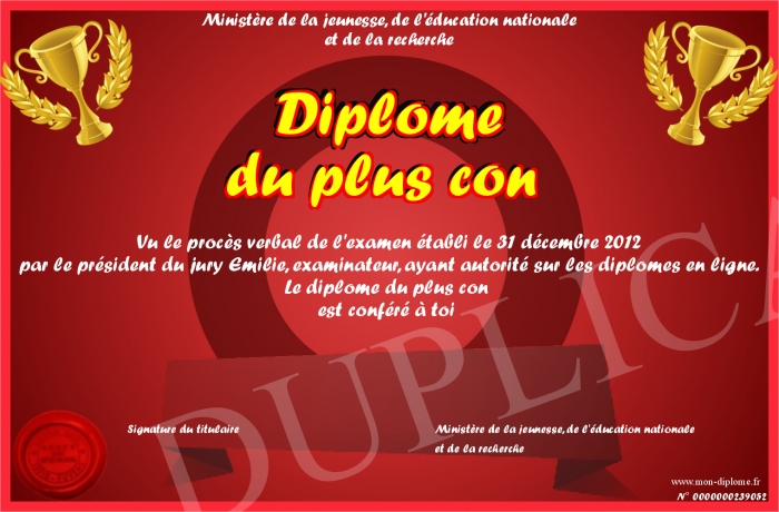 Envoyez par email votre Diplôme du plus con personalisé