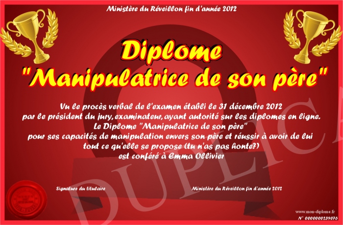 Envoyez par email votre Diplôme -Manipulatrice de son père- personalisé