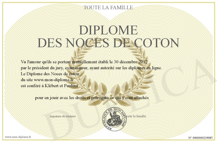 Envoyez par email votre Diplôme des Noces de coton personalisé