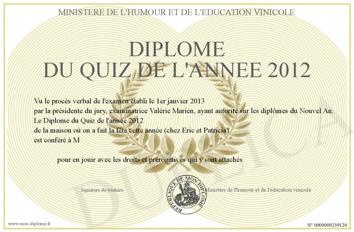Envoyez par email votre Diplôme du Quiz de l'année 2012 personalisé