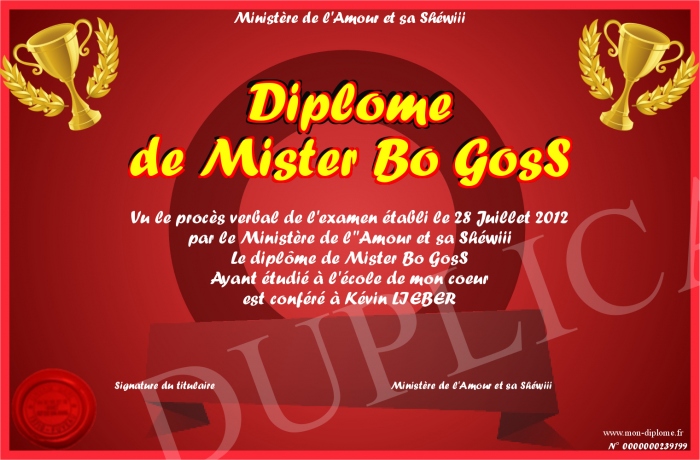 Envoyez par email votre Diplôme de Mister Bo GosS personalisé