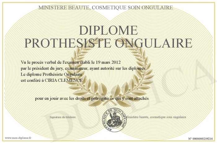 Envoyez par email votre Diplôme Prothésiste Ongulaire personalisé
