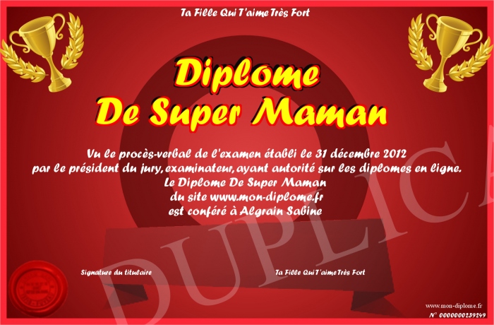 Envoyez par email votre Diplôme De Super Maman personalisé