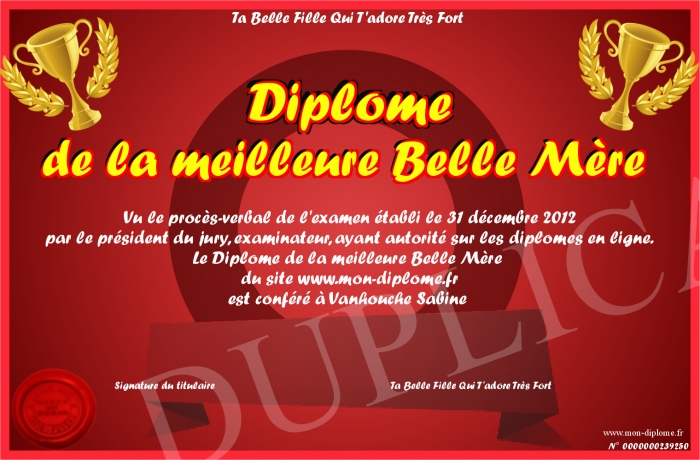 Envoyez par email votre Diplome de la meilleure Belle Mère personalisé
