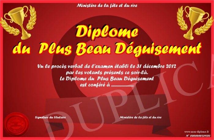 Envoyez par email votre Diplôme du Plus Beau Déguisement personalisé