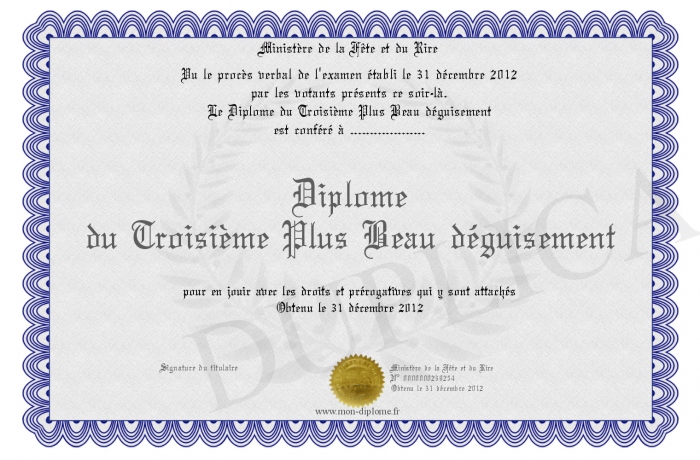 Envoyez par email votre Diplôme du Troisième Plus Beau déguisement personalisé