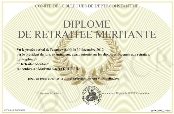 Envoyez par email votre Diplôme de Retraitée Méritante personalisé