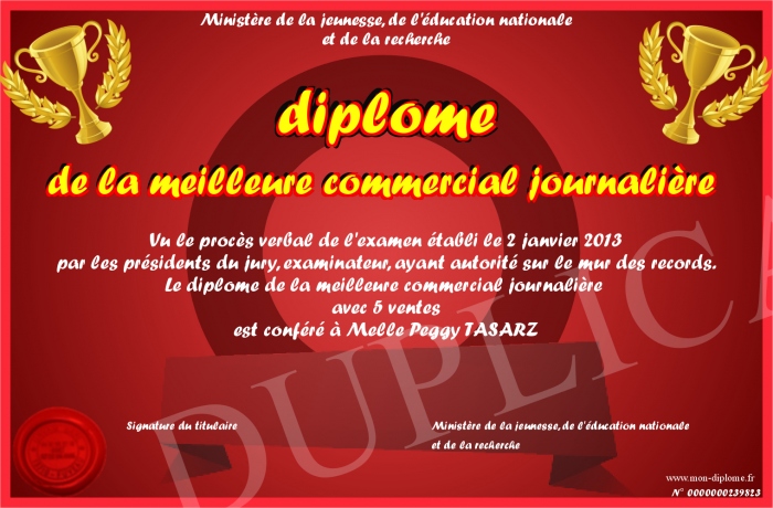 Envoyez par email votre diplome de la meilleure commercial journalière personalisé