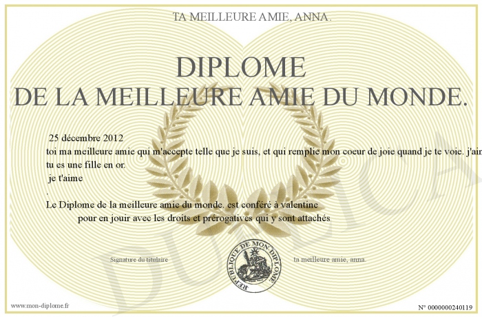 Envoyez par email votre Diplôme de la meilleure amie du monde. personalisé