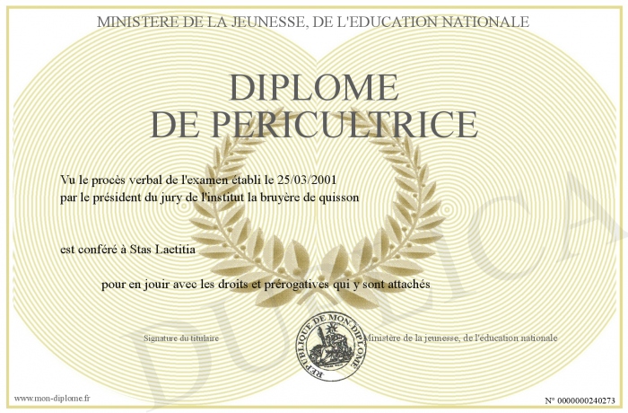 Envoyez par email votre Diplôme de péricultrice personalisé
