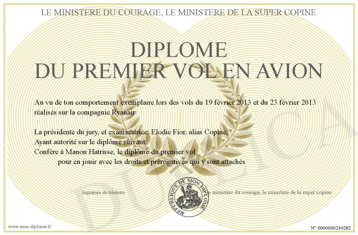 Envoyez par email votre diplôme du premier vol en avion personalisé