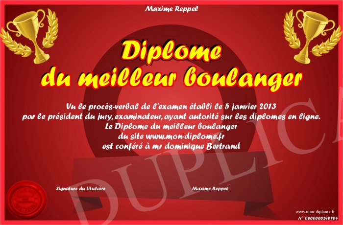 Envoyez par email votre Diplôme du meilleur boulanger personalisé