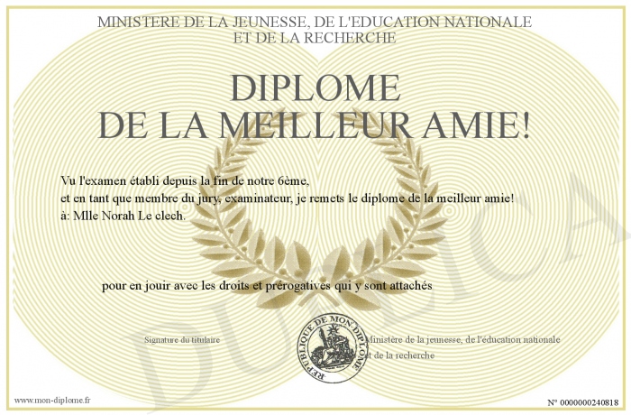 Envoyez par email votre diplôme de la meilleur amie! personalisé