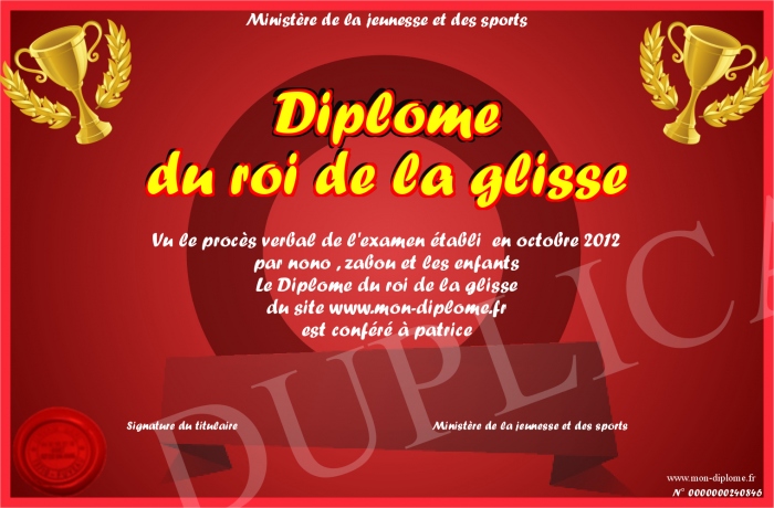 Envoyez par email votre Diplôme du roi de la glisse personalisé