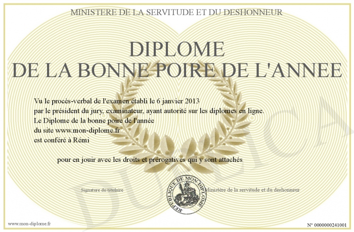 Envoyez par email votre Diplôme de la bonne poire de l'année personalisé
