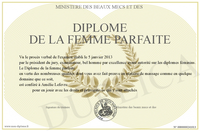 Envoyez par email votre Diplôme de la femme parfaite personalisé