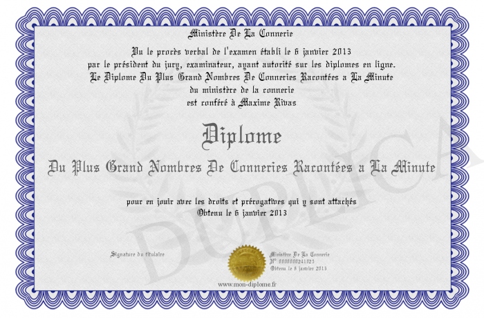 Envoyez par email votre Diplome Du Plus Grand Nombres De Conneries Racontées a La Minute personalisé